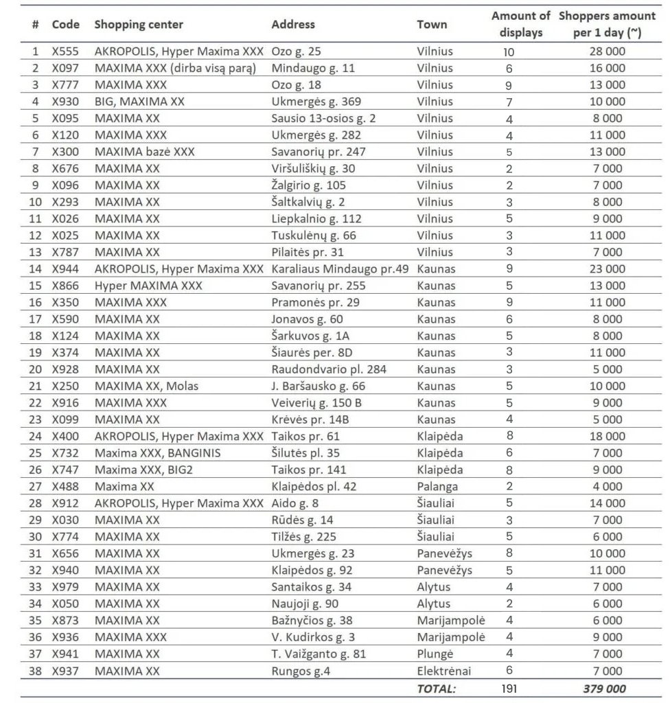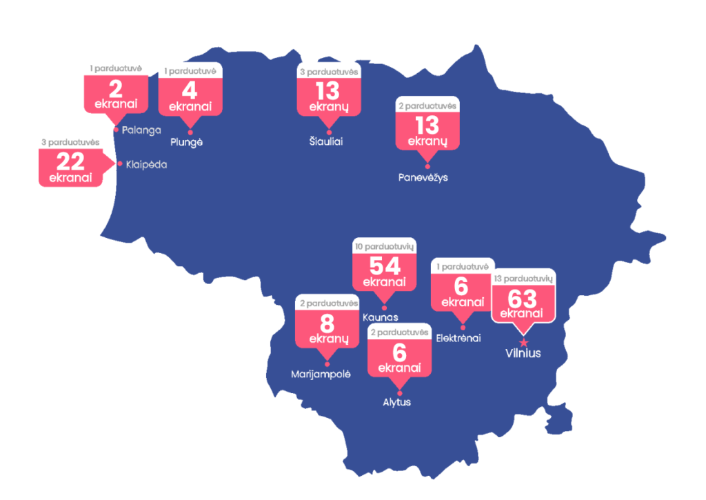 TV displays network consist of 38 stores, 205 TV displays, 10 towns in Lithuania.